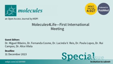 You can submit your research or review to Molecules special Issue "Molecules4Life - First International Meeting". Manuscripts should be submitted through MDPI online submission system https://www.mdpi.com/journal/molecules/special_issues/5YJ514B6IV. Authors are encouraged to use the Microsoft Word template or LaTeX template to prepare their manuscript. Deadline for manuscript submissions is December 31, 2023. The Article Processing Charge (APC) for publication in this open access journal is 2300 CHF (Swiss Francs). This Special Issue is open not only to participants of the Molecules4Life-First International Meeting, all researchers interested in the field of “Molecules” are welcome to contribute. Responsible guest editor: Dr. Miguel Ribeiro.